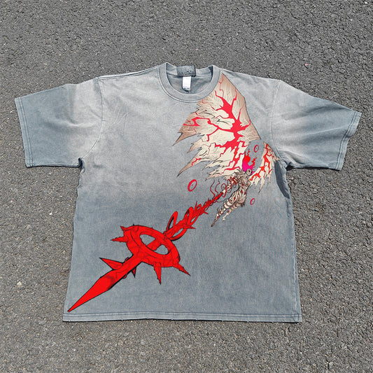 Angel Pattern Punk T-shirt DTG Printed Vintage Pickled Cotton Shirt